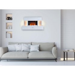 Cheminée électrique décorative avec chauffage ceramique.Habillage blanc laquée et rampes led latérales et télécommande largeur 90 cm.