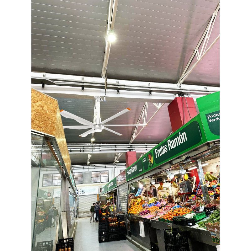 Ce ventilateur HVLS est non seulement puissant et efficace, mais il peut également être utilisé en hiver pour redistribuer la chaleur accumulée au plafond, équilibrant ainsi la température ambiante.